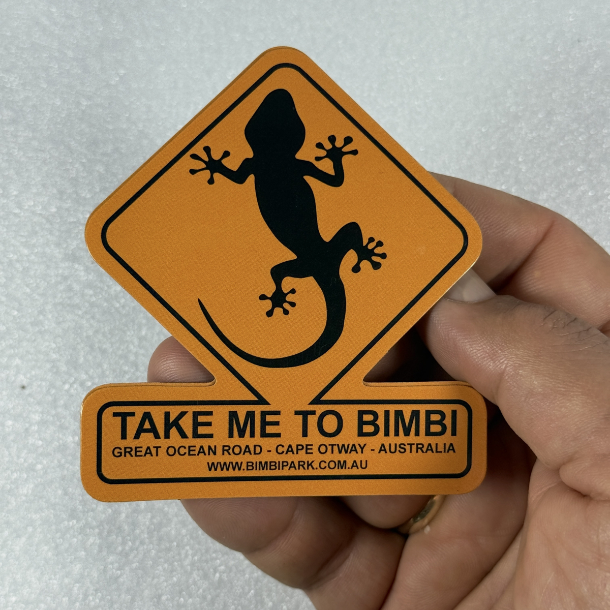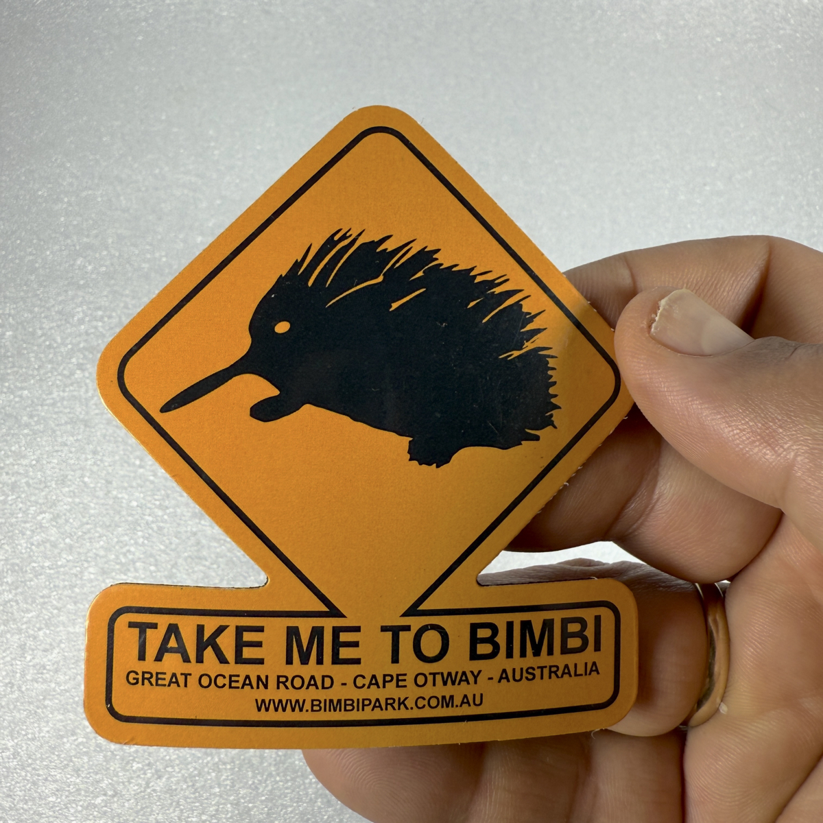 Aussie-made “Take Me To Bimbi” fridge magnets featuring classic wildlife road-sign designs — Gecko, Echidna, Kangaroo and Koala. Printed on glossy stock, 80mm × 90mm, and perfect as a Bimbi Park souvenir. Choose your favourite design before adding to cart. Great size 80mm X 90mm