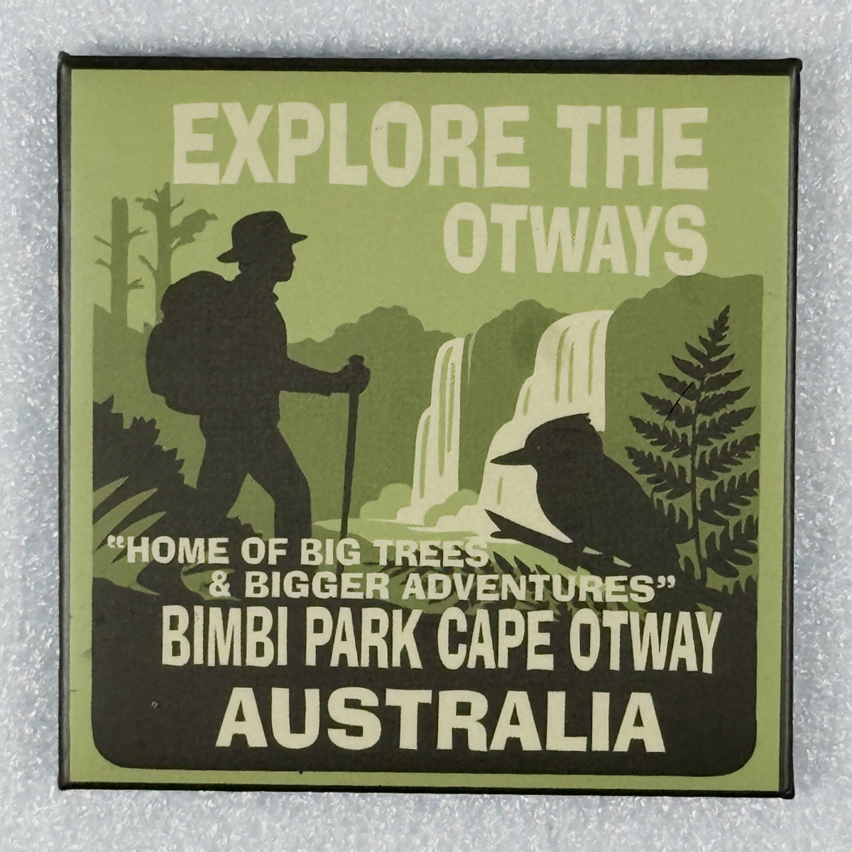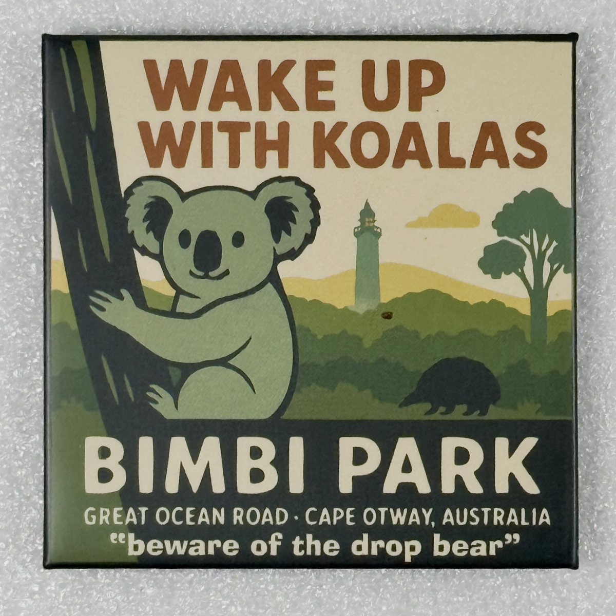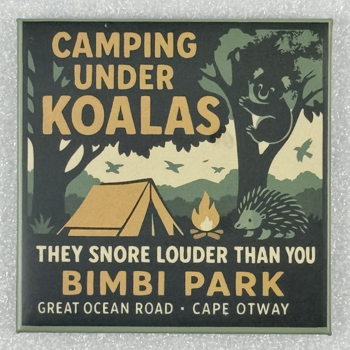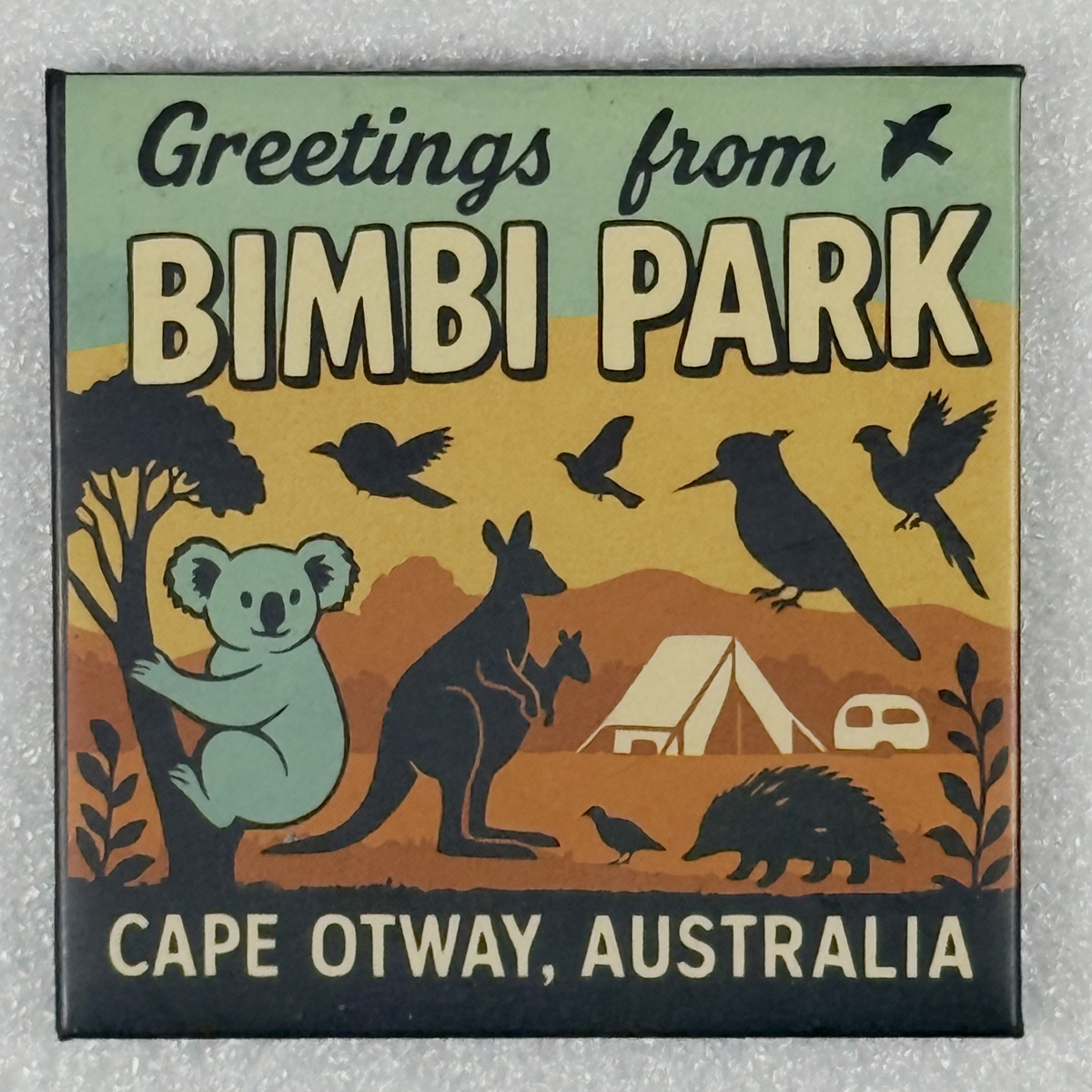 Our Premium Bimbi Park metal magnets are perfect as travel mementoes, stocking fillers, birthday gifts, caravan décor, workplace reminders of your holiday, or thoughtful souvenirs for international visitors wanting something truly Australian. They also make great add-ons for guests booking the Great Ocean Walk, school groups, families, or anyone exploring the Otways for the first time.