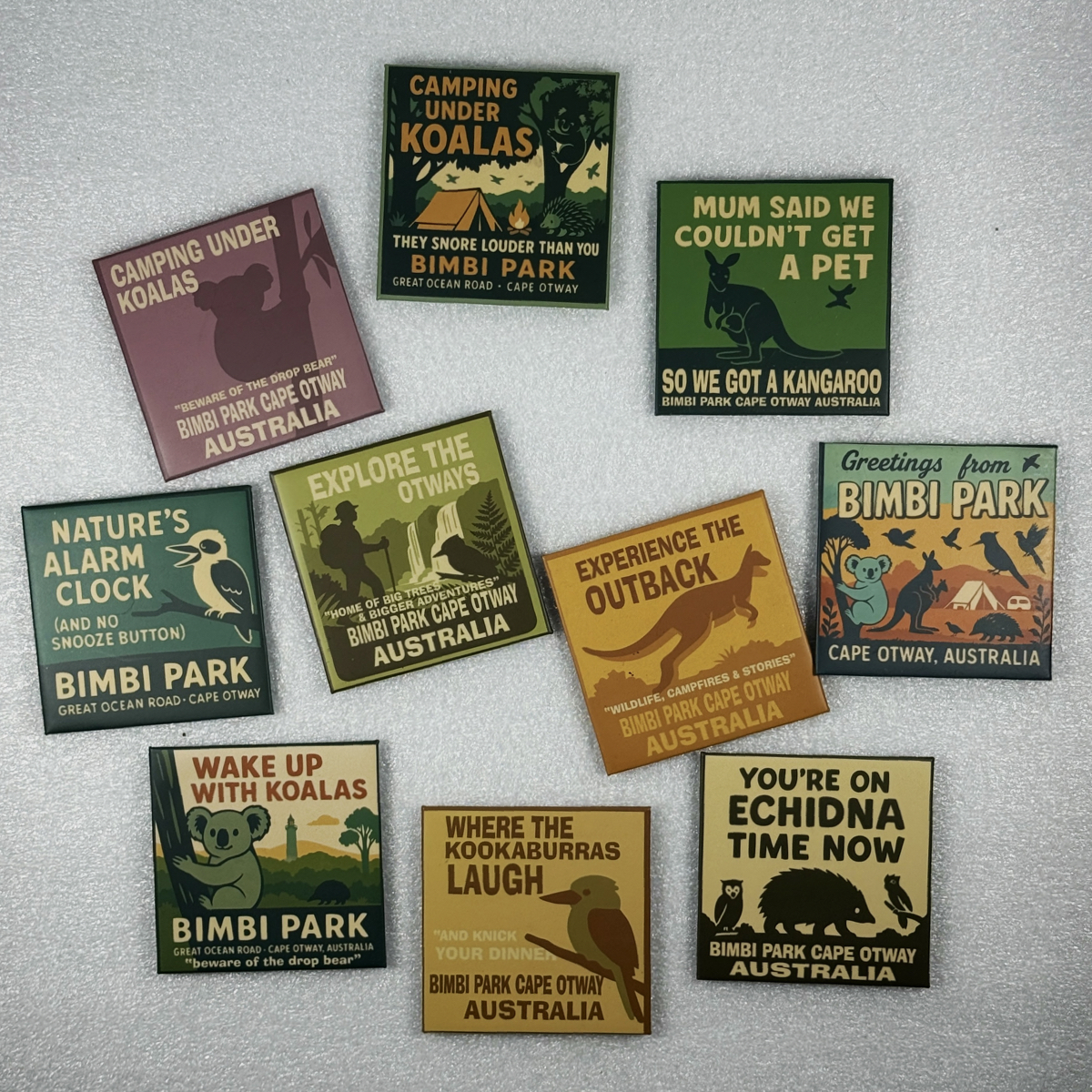 Whether you choose one or collect all ten, these magnets are a charming way to bring the wildlife, humour and spirit of Bimbi Park into your home. Each magnet is a reminder of campfires, starry nights, morning kookaburras and koalas settled in the trees above your cabin or campsite — the memories that make Bimbi Park unforgettable.