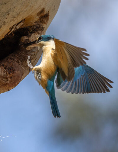 The Sacred Kingfisher is a medium-sized bird with a turquoise back, blue rump and tail, buff-white underparts, and a broad cream collar. It has a black eye stripe from the bill to the nape of the neck. Males and females look similar, though females are generally lighter with duller upper parts. Juveniles resemble females but have rusty-brown feather edges on the collar and underparts, and buff edges on the wing coverts. This species inhabits woodlands, mangroves, paperbark forests, tall open eucalypt forests, and melaleuca forests. At Bimbi they have a nest on the bottom block.